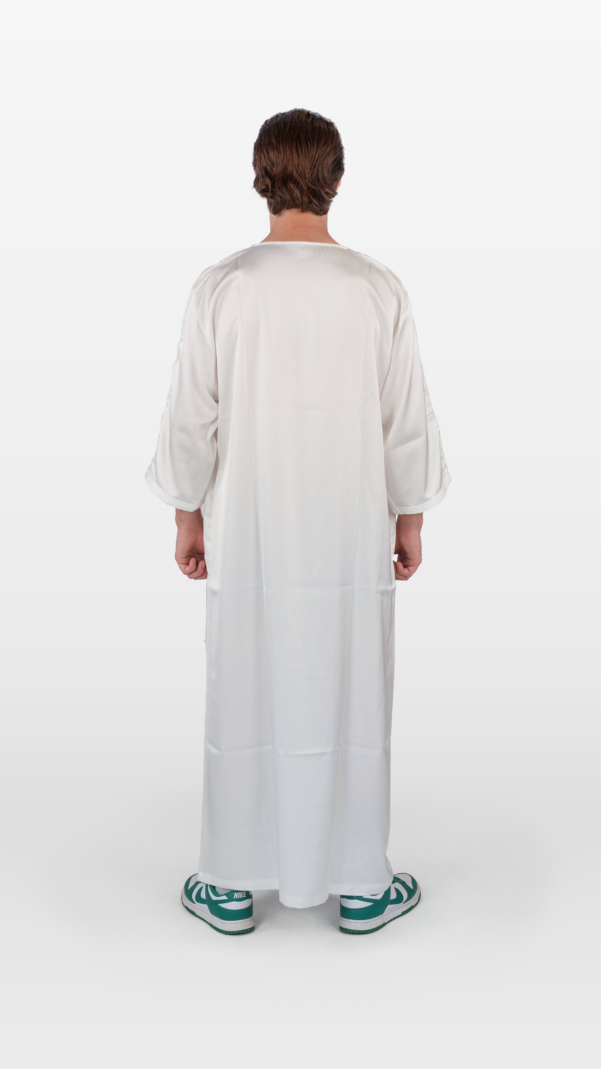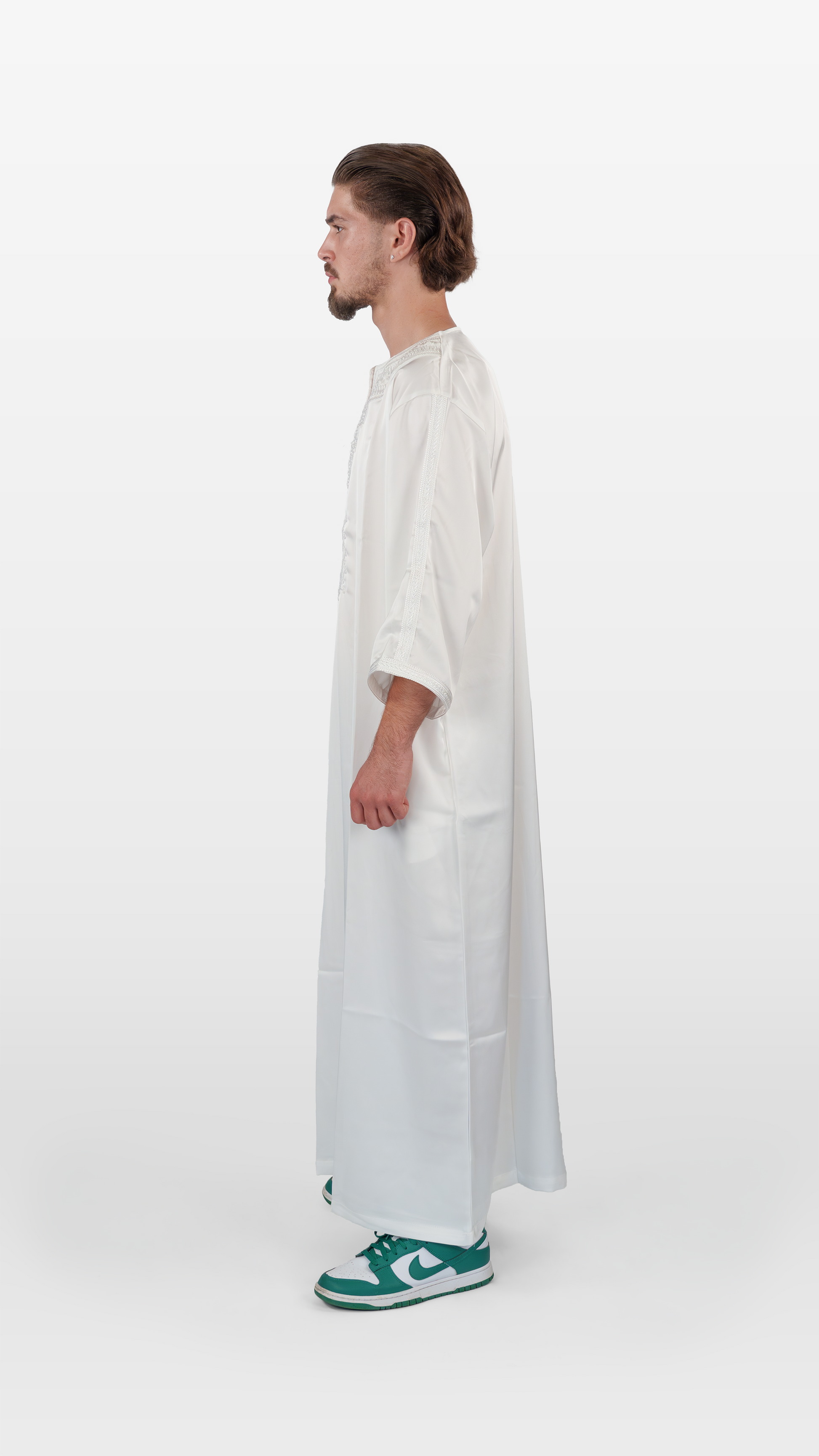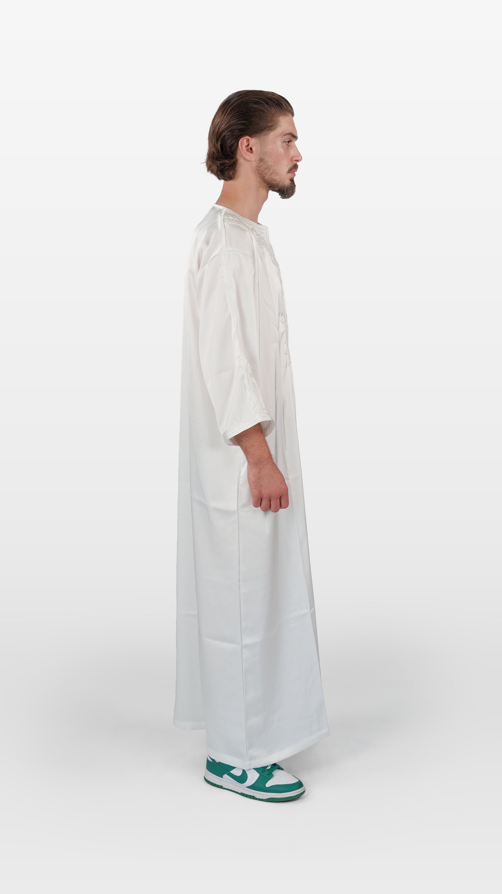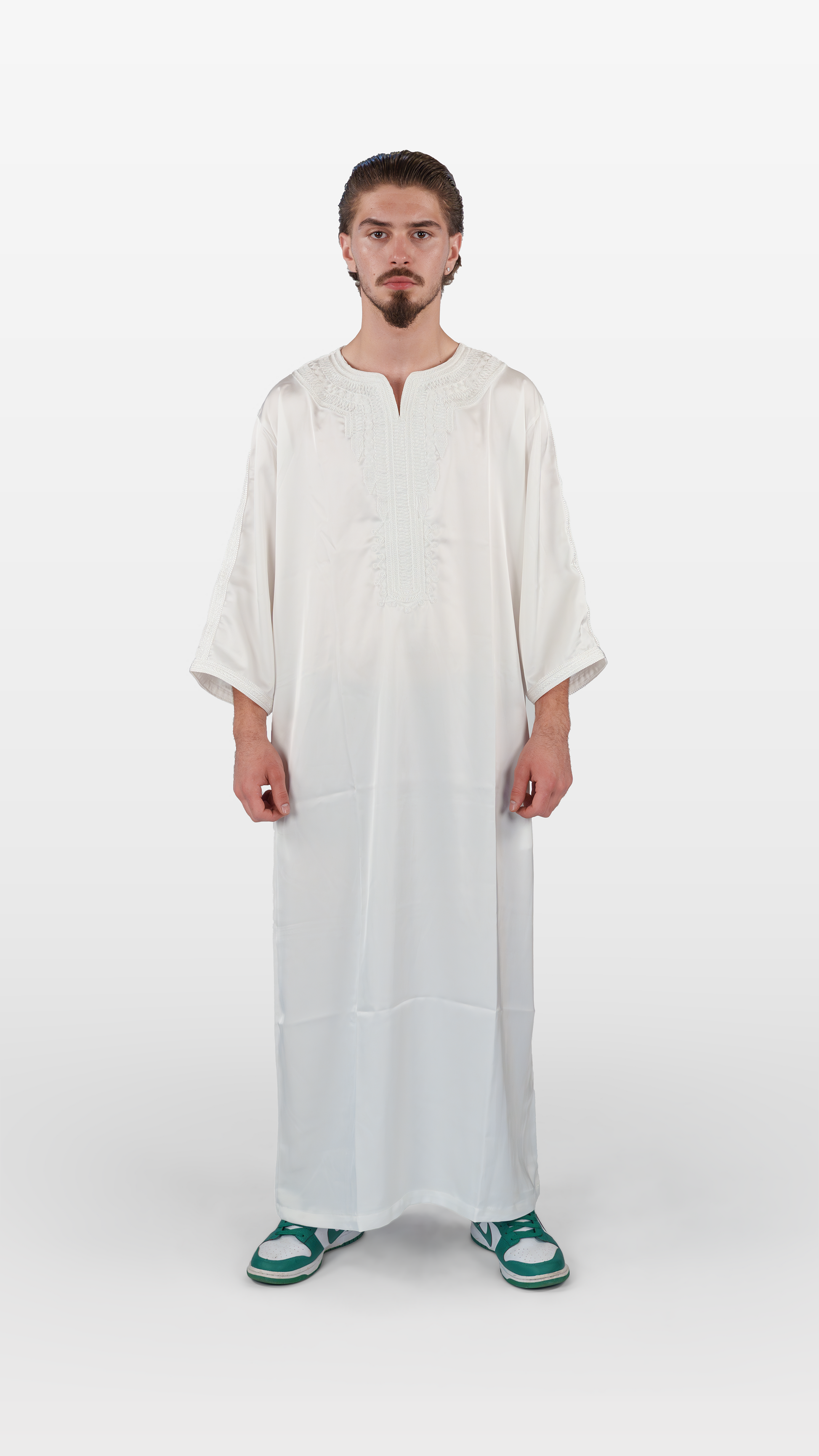 Gefertigt aus hochwertigem Feinsatin-Stoff, überzeugt sie mit einem angenehmen Fall, dezentem Glanz und präziser Stickerei. Ob im Alltag oder zu besonderen Anlässen – diese Jalabiya bringt Charakter, Komfort und Klasse in dein Outfit.