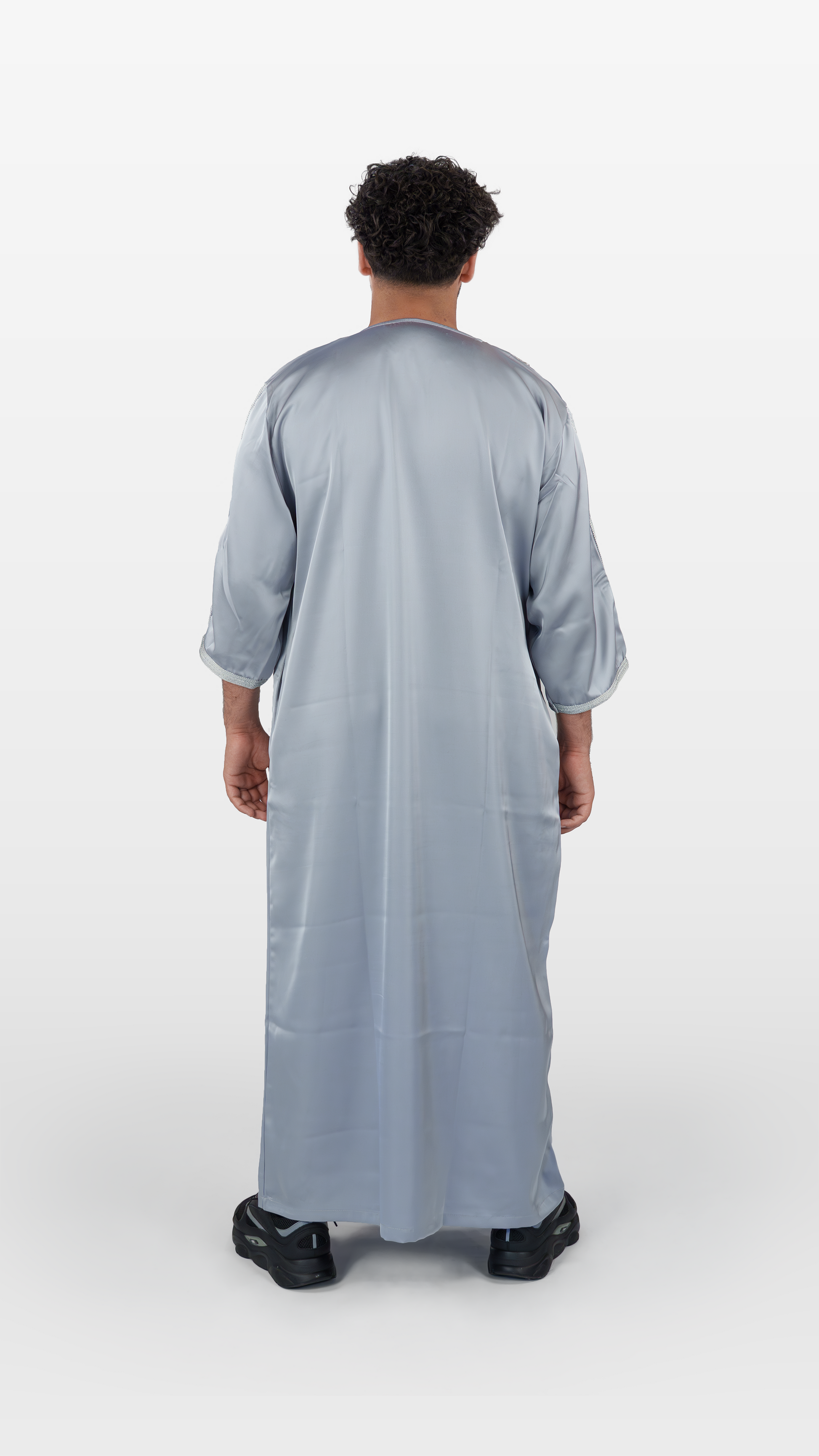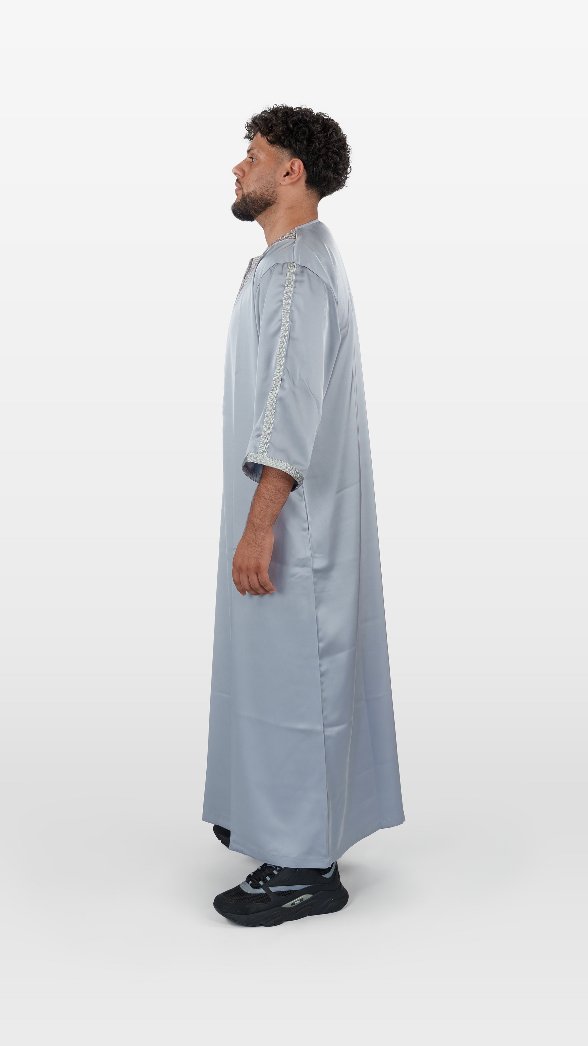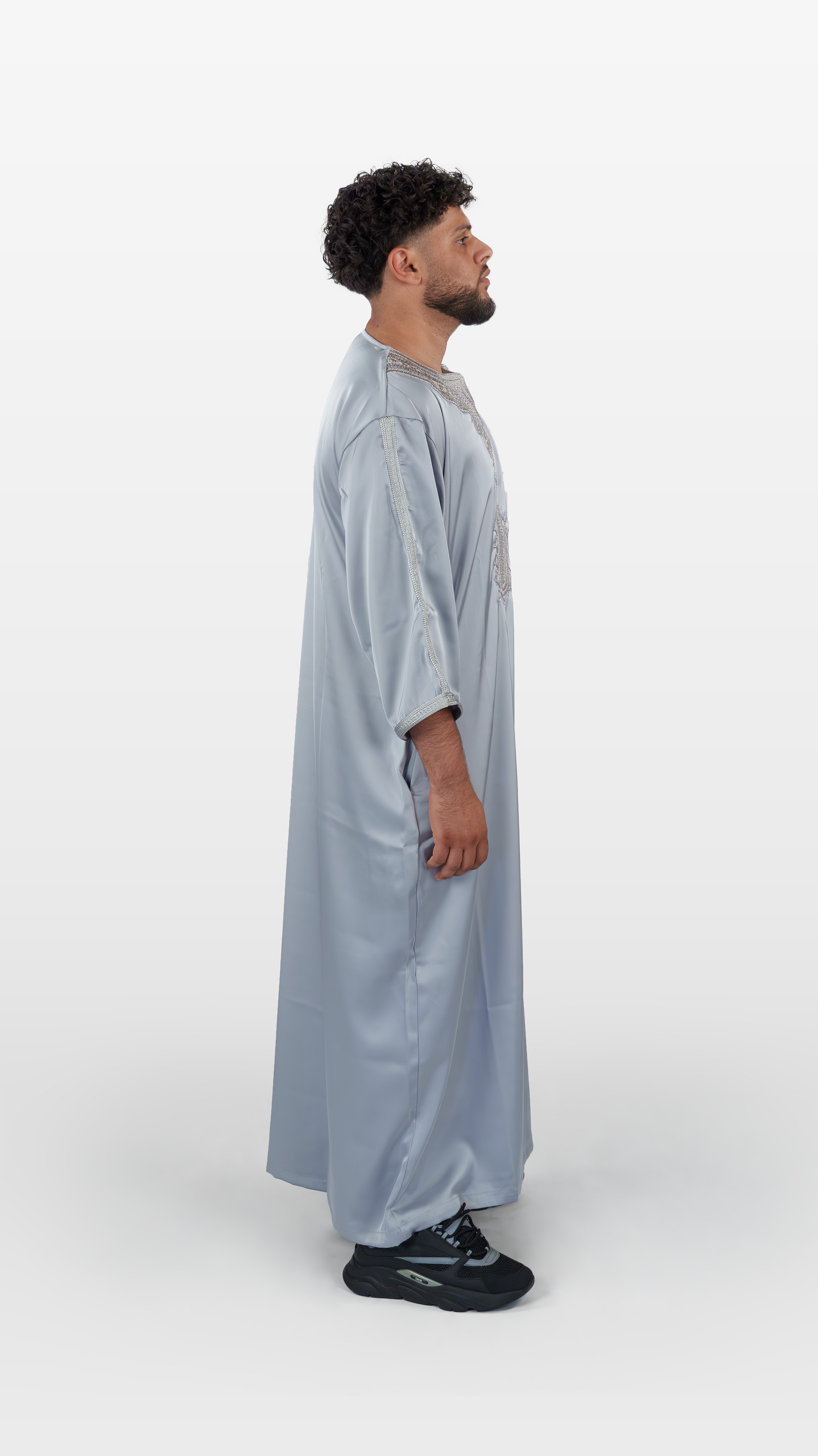 Diese Jalabiya wurde mit Blick für jedes Detail entworfen – vom eleganten Schnitt bis hin zum fein schimmernden Stoff, der an die kunstvollen Stoffmärkte von Marrakesh erinnert. Ein Stück Identität, verpackt in Stil.